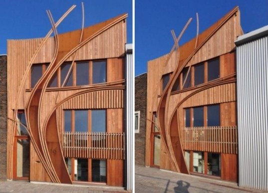 Deze gevel valt me op omdat de manier waarop de stenen zijn gelegd erg origineel is. Ook ge vorm van het gebouw zelf is leuk ontworpen. Wel vind ik die metalen kubus vreemd aan de rechter kant. **